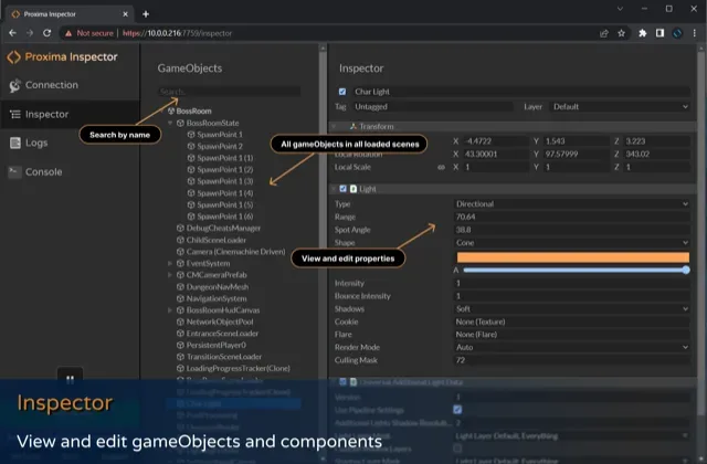 Proxima Inspector lets you connect to your live game from a web browser to inspect and edit any property. Just like the Unity editor!